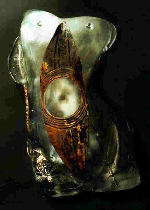 "Female Torso" Joy says; "Our workshop is on a river island nestling in a Peak National Park valley. Our work is inspired by the beauty of these surroundings and by the unequalled magic of the glass making process". Layers of rich, are combined with gold and silver fused into the glass to create their distinctive and exclusive style. Large plates with vibrant radiant images speak of eternal tales. |